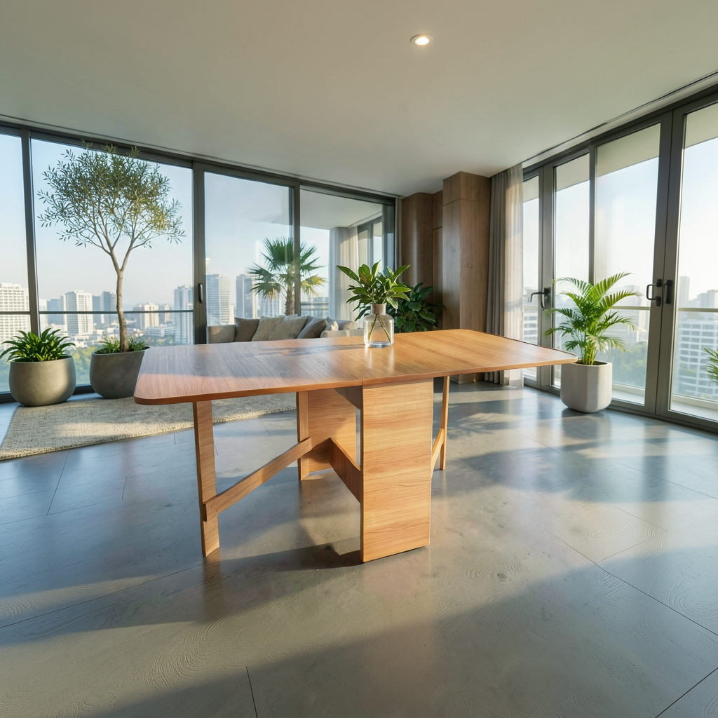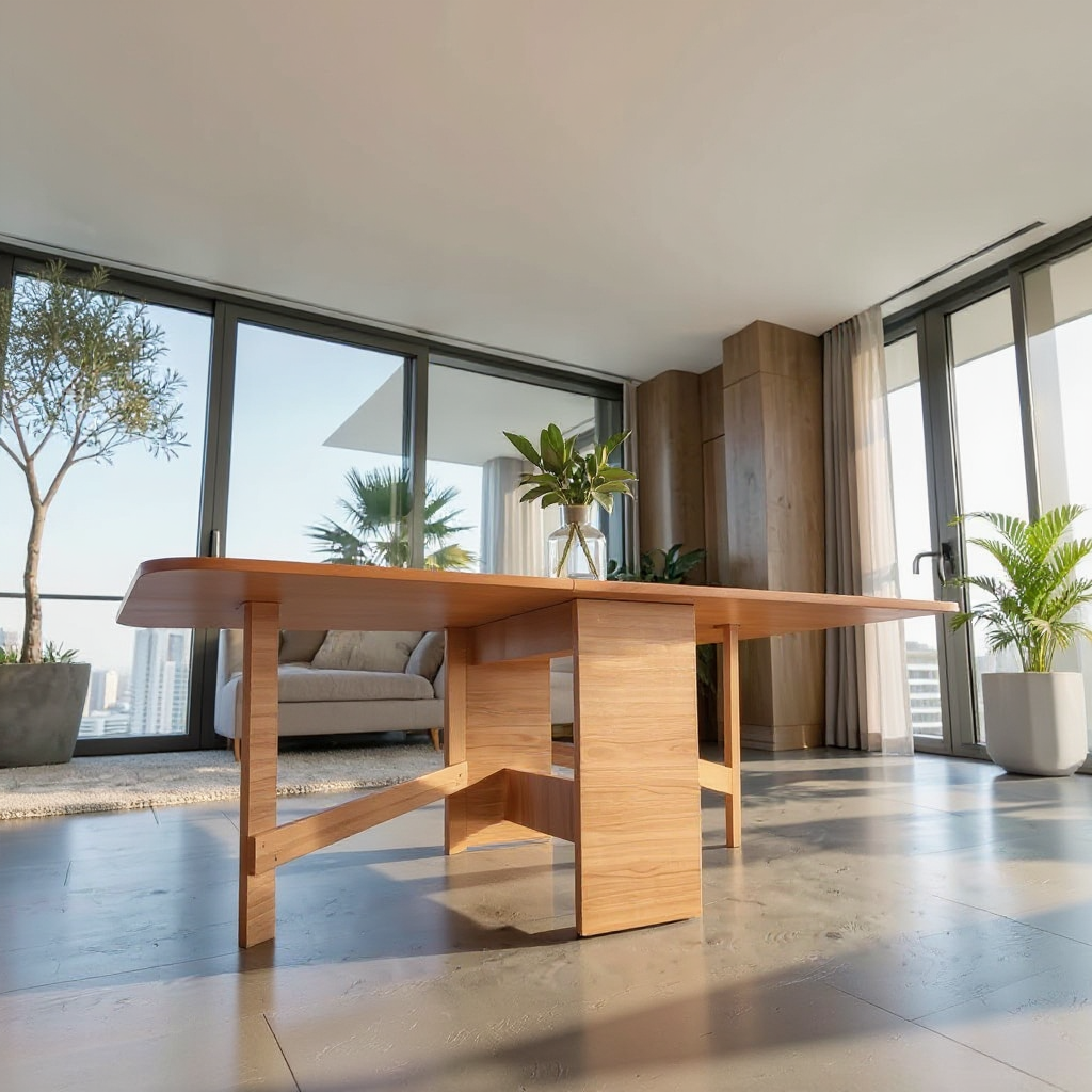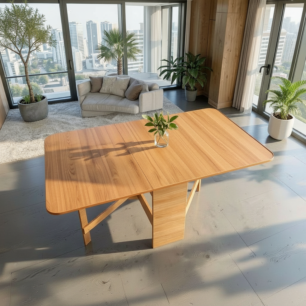 Este o masa plianta, realizata din PAL melaminat, ce permite reglarea dimensiunii, prin ridicarea uneia sau a ambelor parti, in functie de necesitate. Cele 2 parti laterale sunt sustinute de un cadru de PAL, ce se roteste cu usurinta datorita balamalelor cu care este prins.