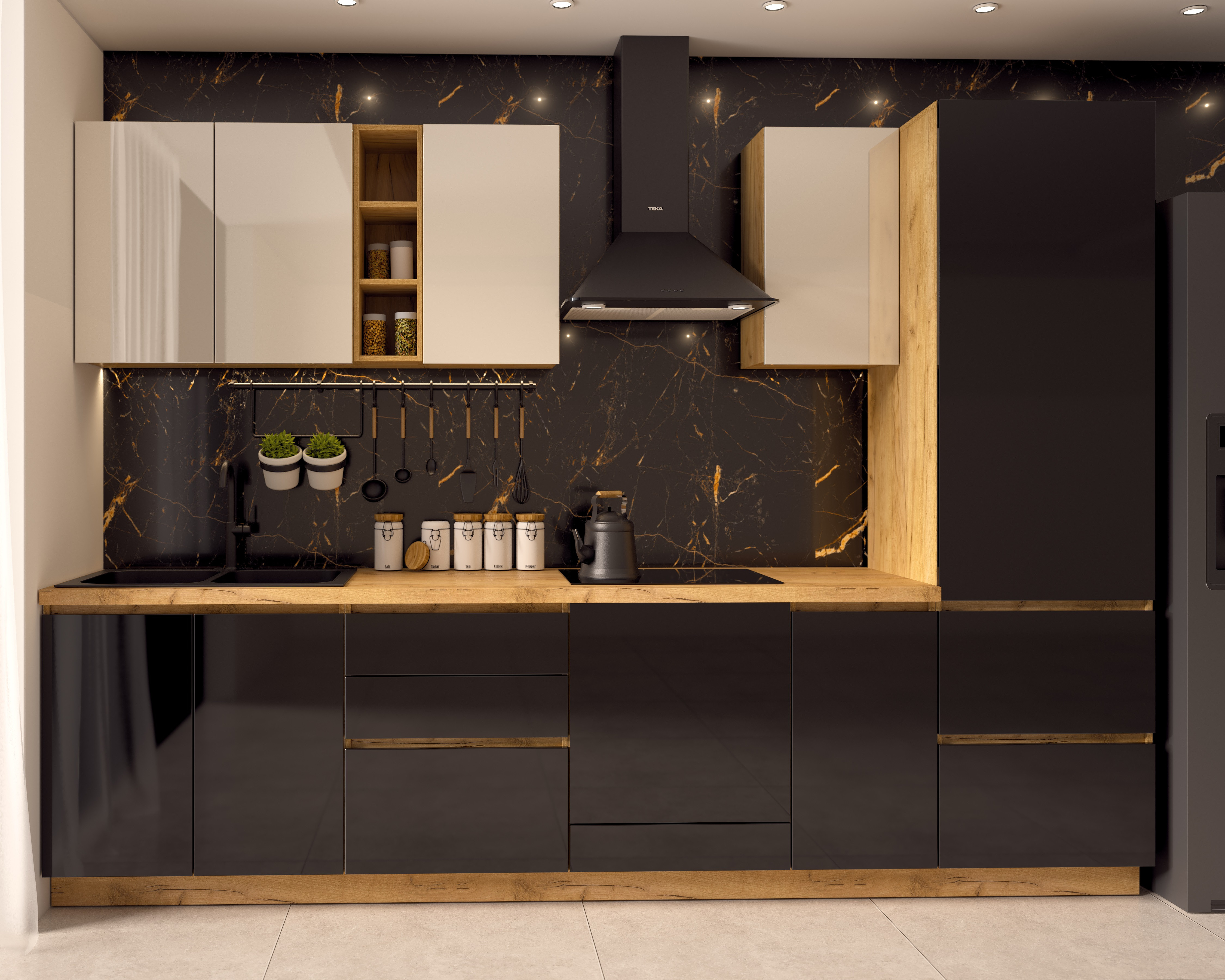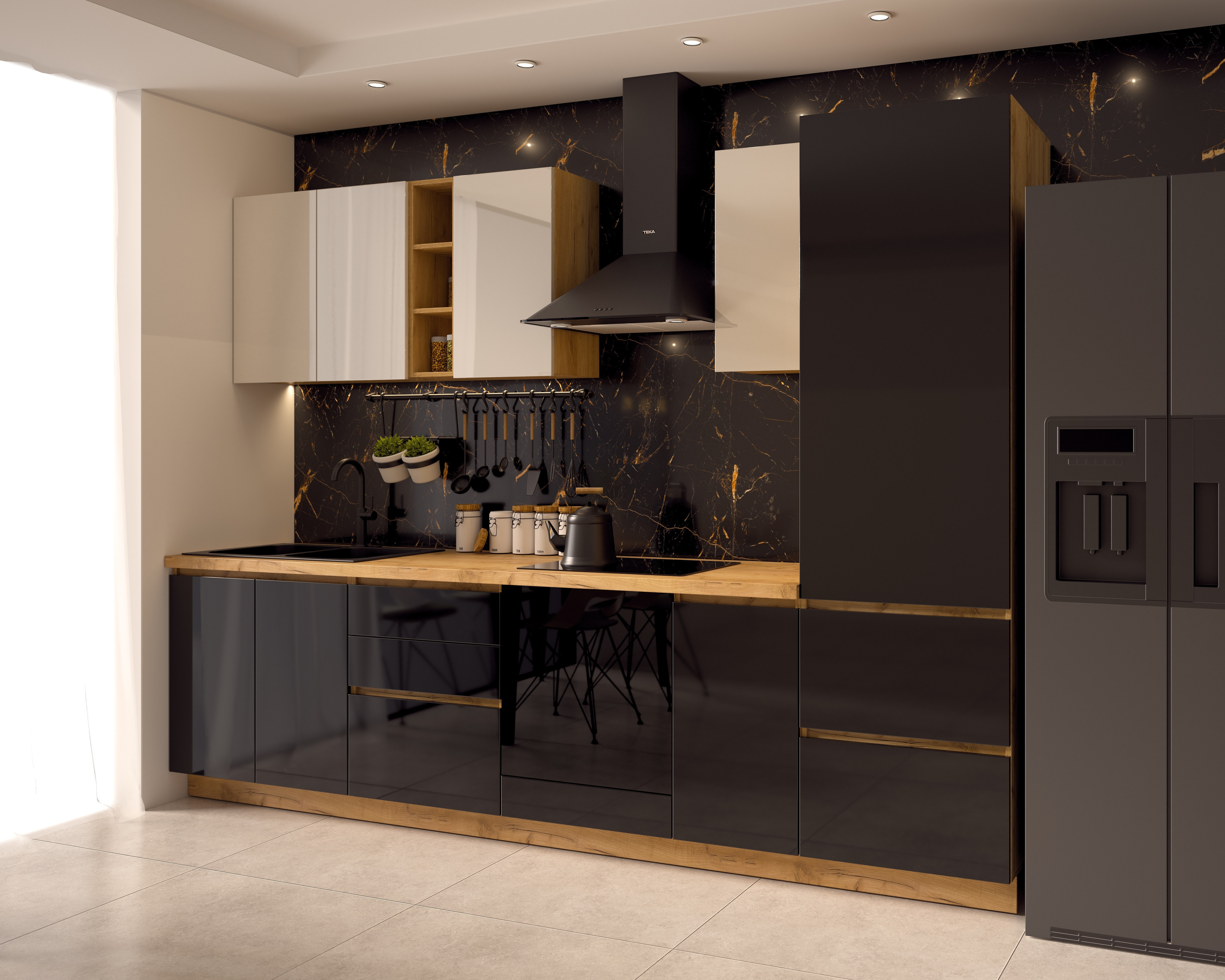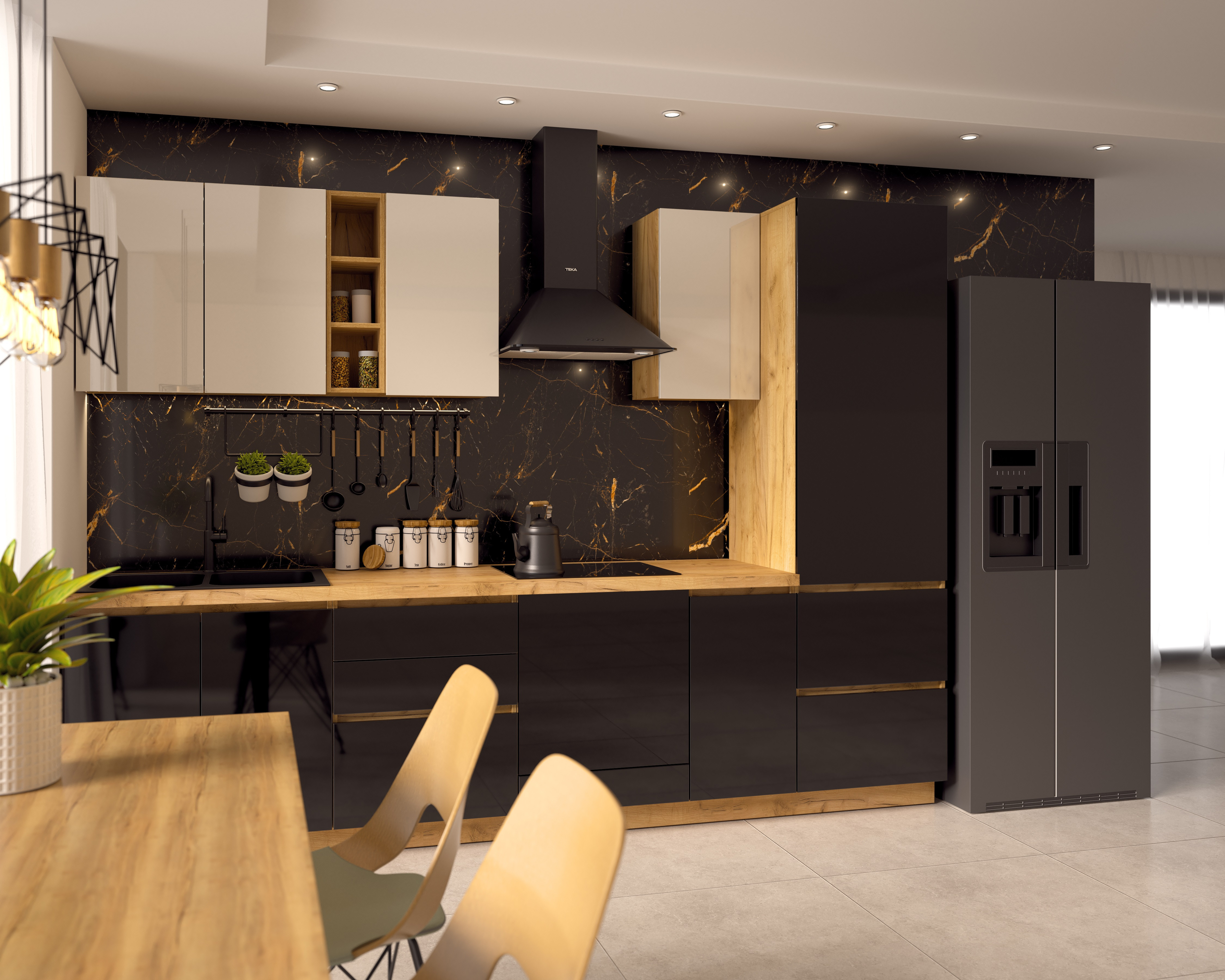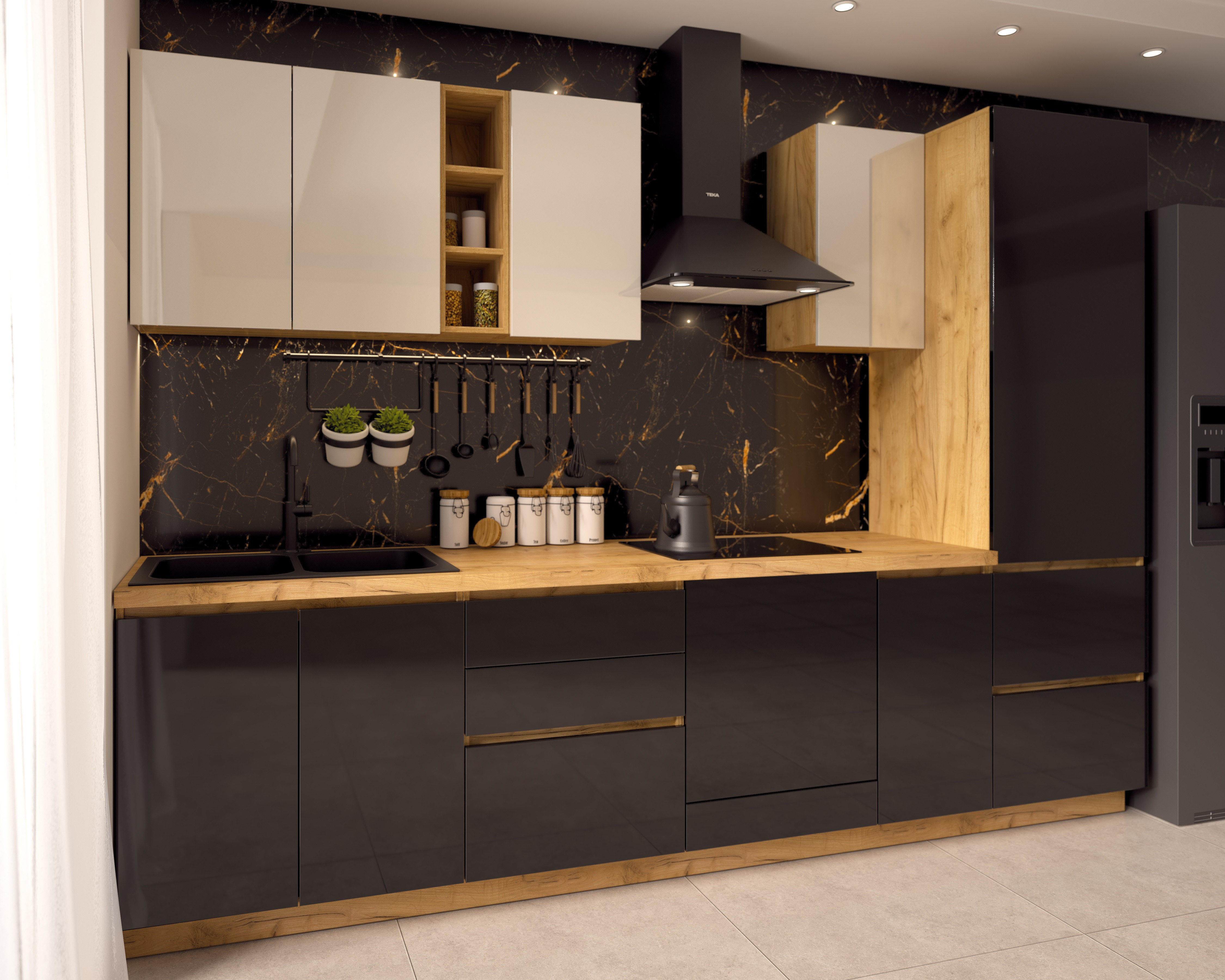 Bucatarie Chelsea, Stejar K003 - Alb/Negru, 300x60x215cm
