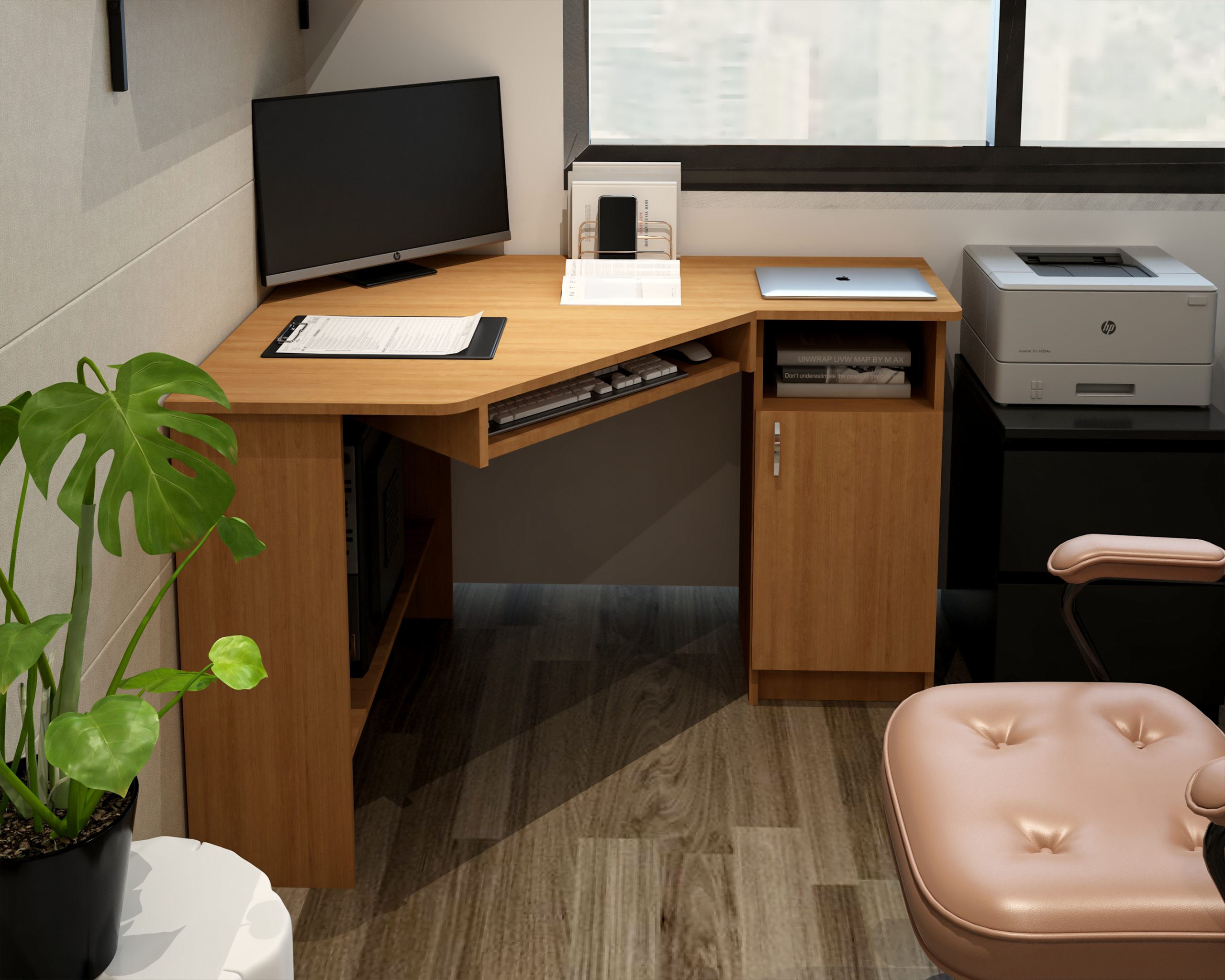 Biroul SU 1 este un birou pe colt, prevazut, pe latura din stanga ( lungime =90cm ), cu suport glisant pentru tastatura si un raft depozitare in partea inferioara. Latura din partea dreapta ( lungime 120cm ), este prevazuta cu 1 corp cu 3 rafturi si 1 usa.