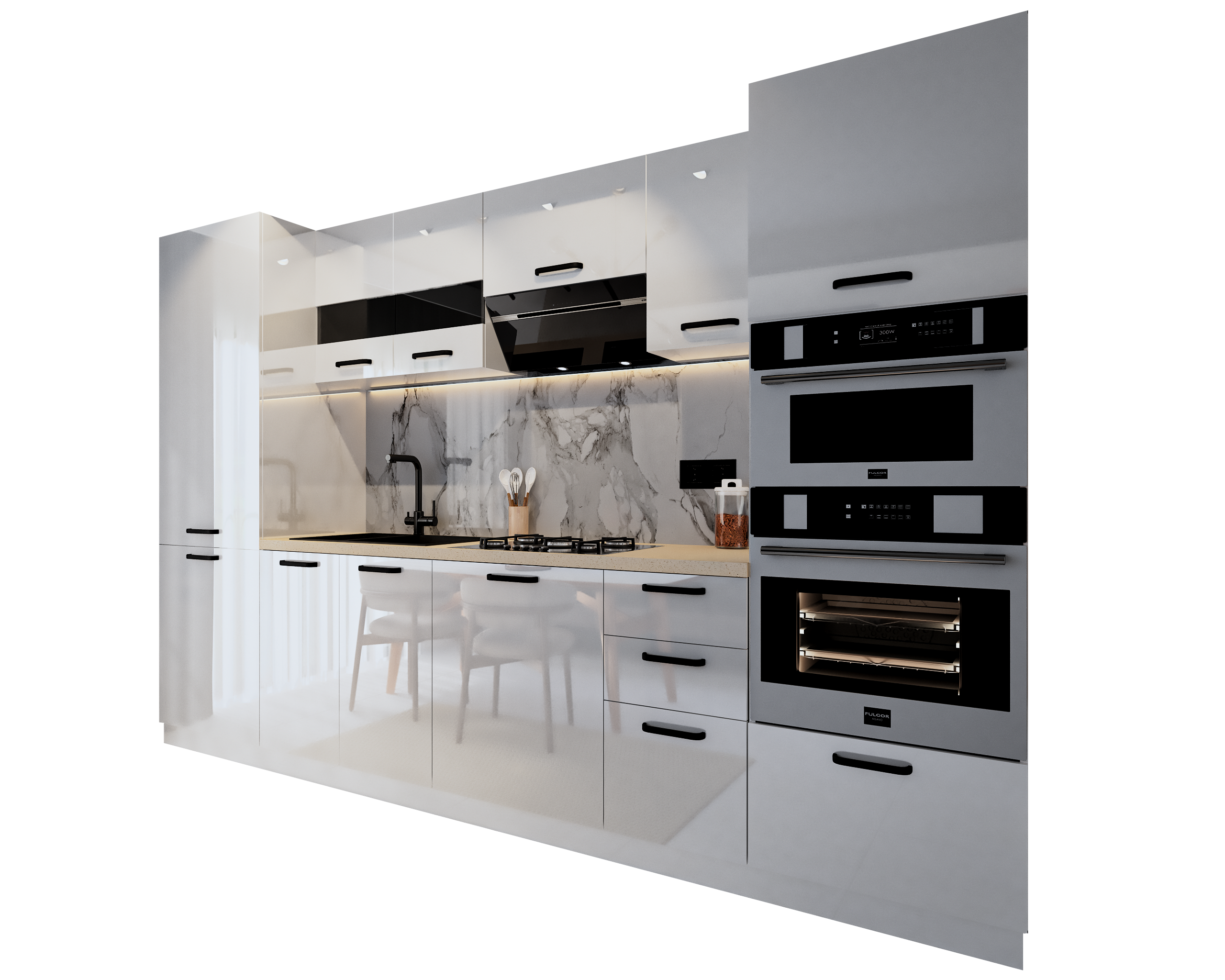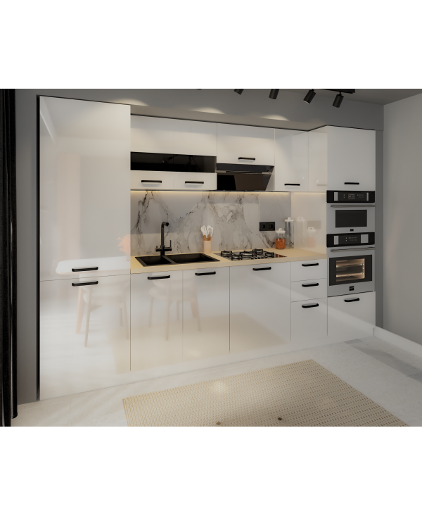 Bucatarie Daria,V1 MDF Acril Alb Lucios, 303x60x200cm