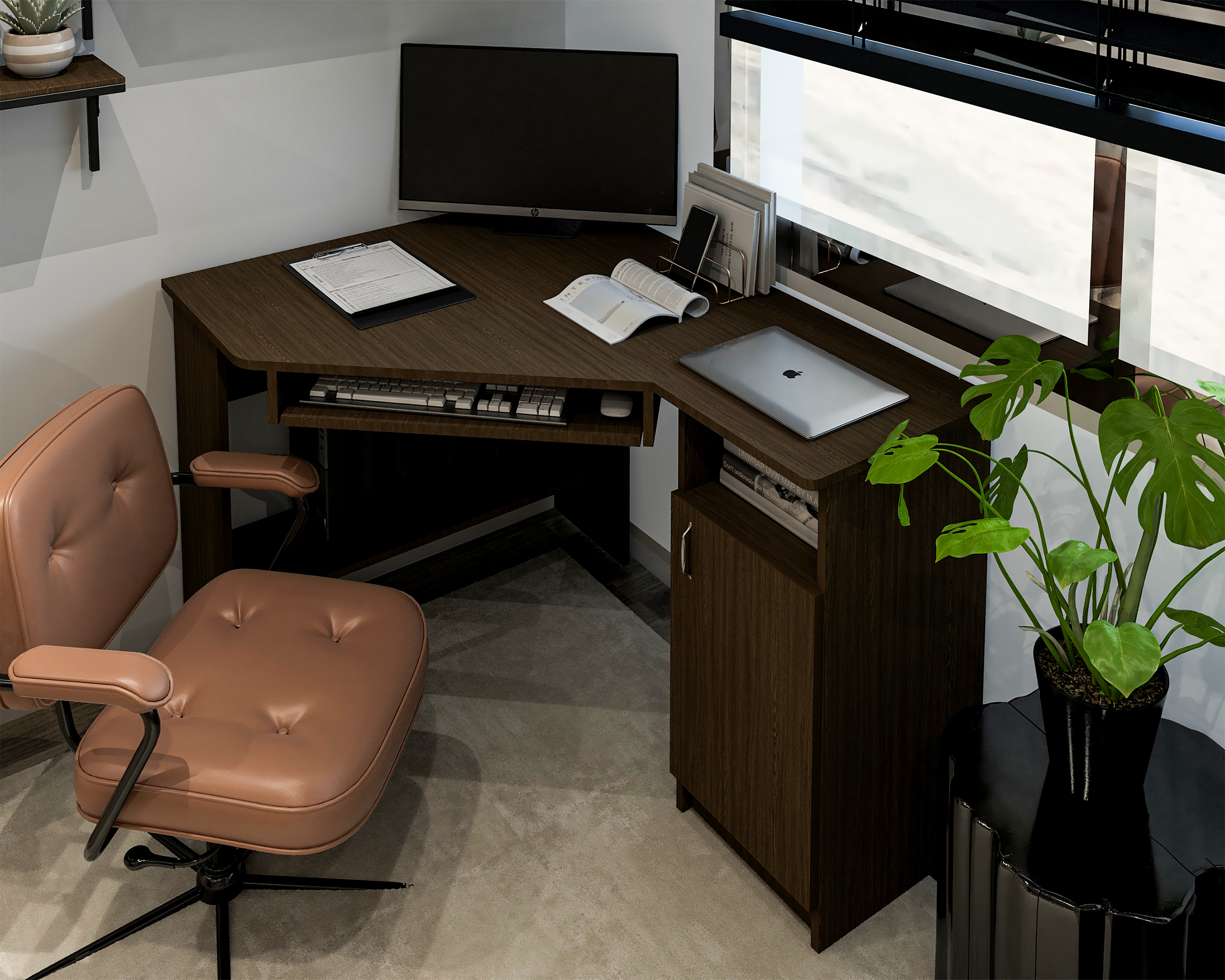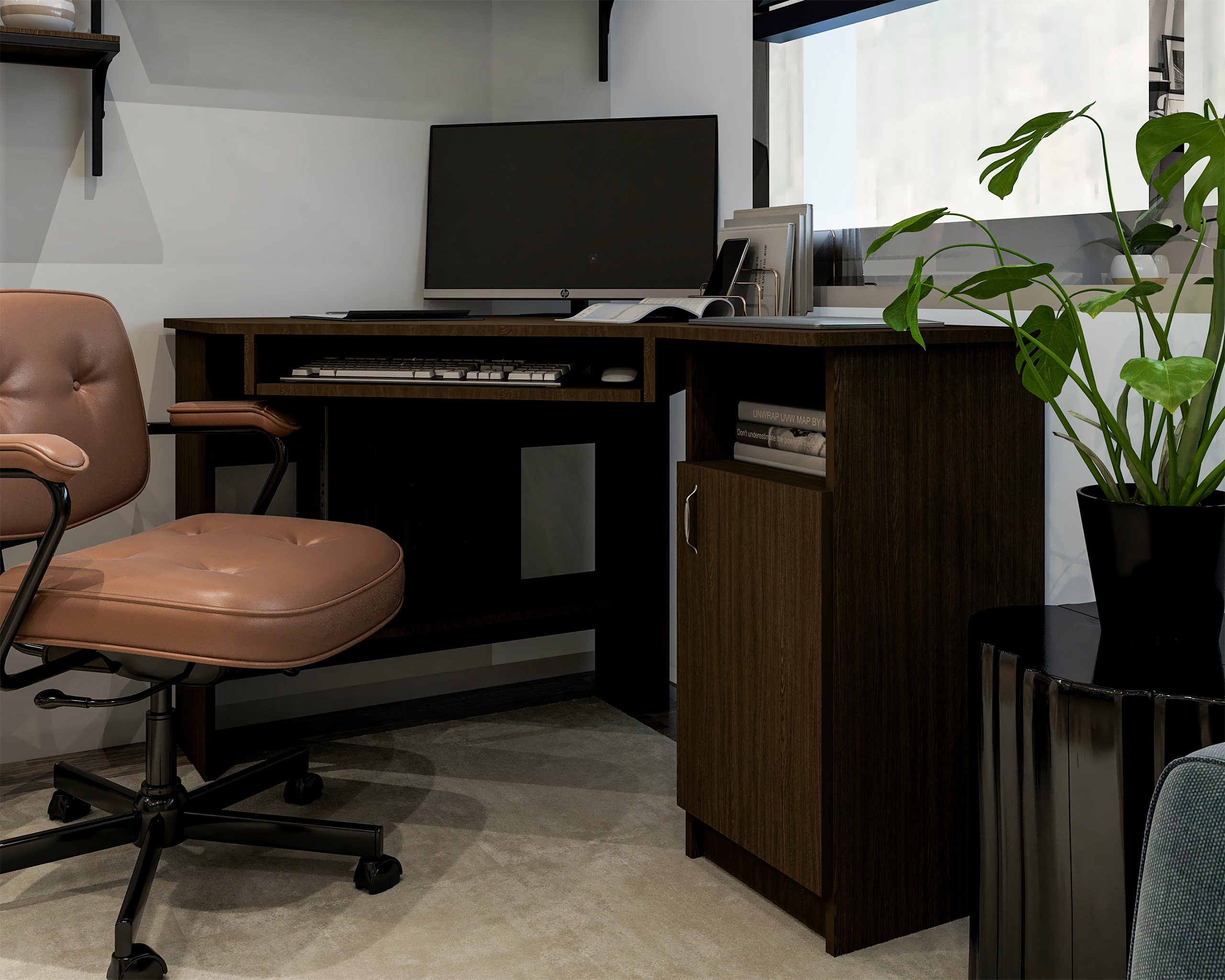 Biroul SU 13 este un birou pe colt, prevazut, pe latura din stanga ( lungime =90cm ), cu suport glisant pentru tastatura si un raft depozitare in partea inferioara. Latura din partea dreapta ( lungime 120cm ), este prevazuta cu 1 corp cu 3 rafturi si 1 usa.