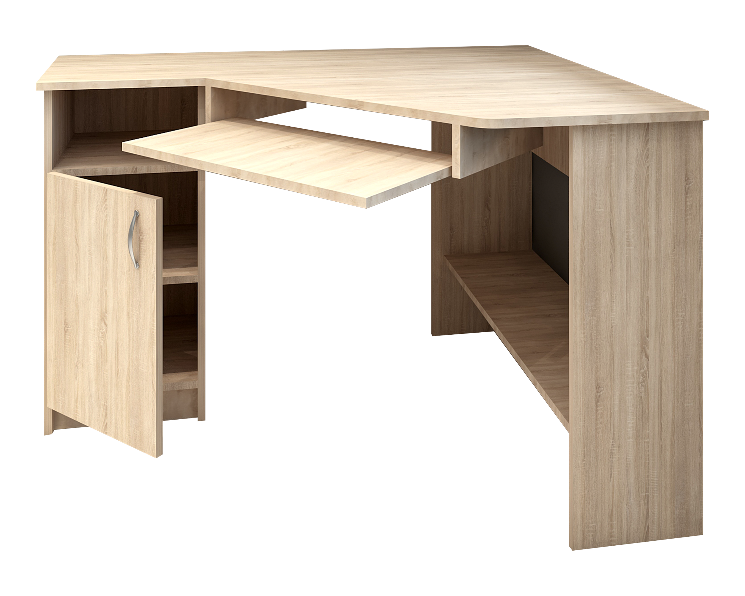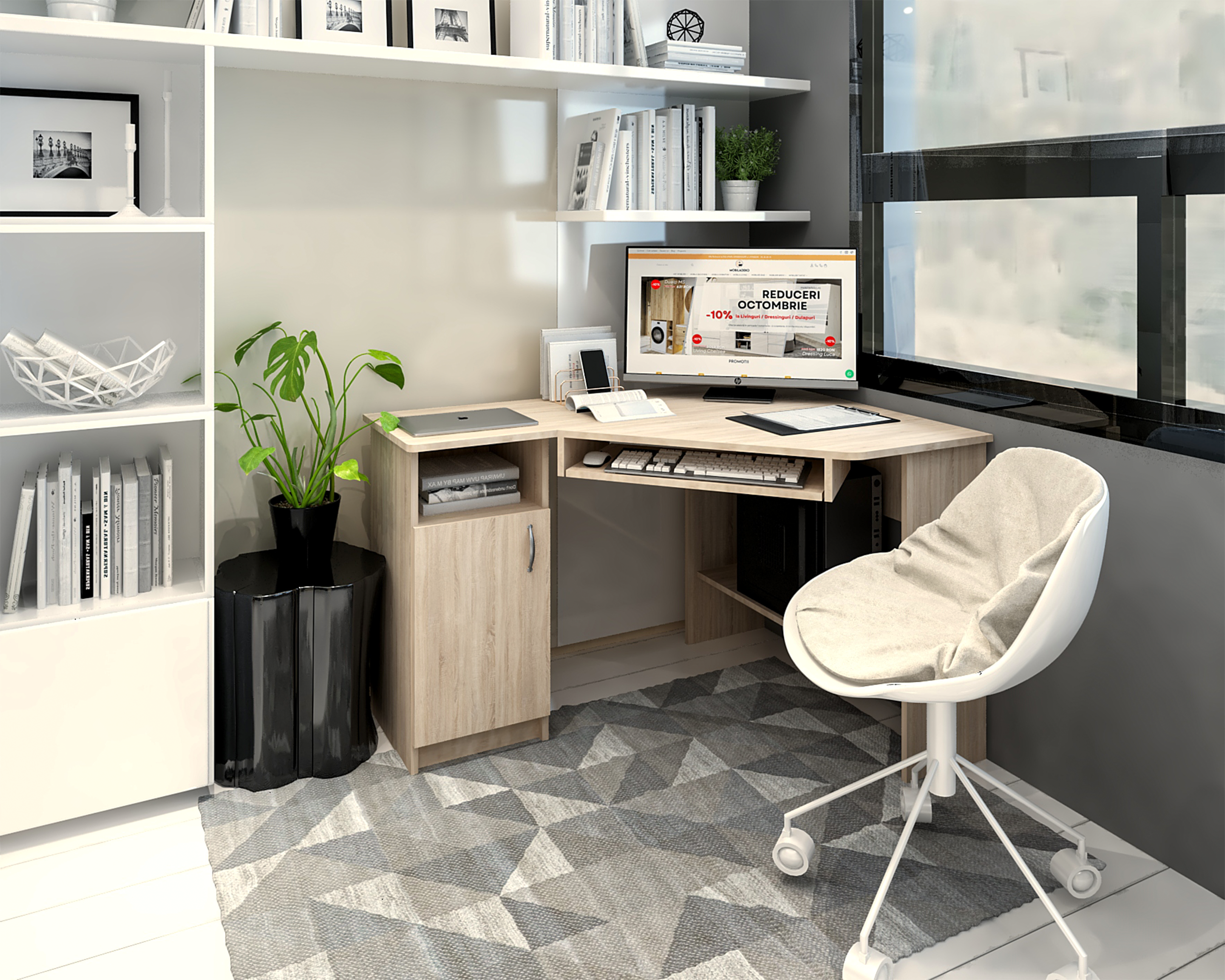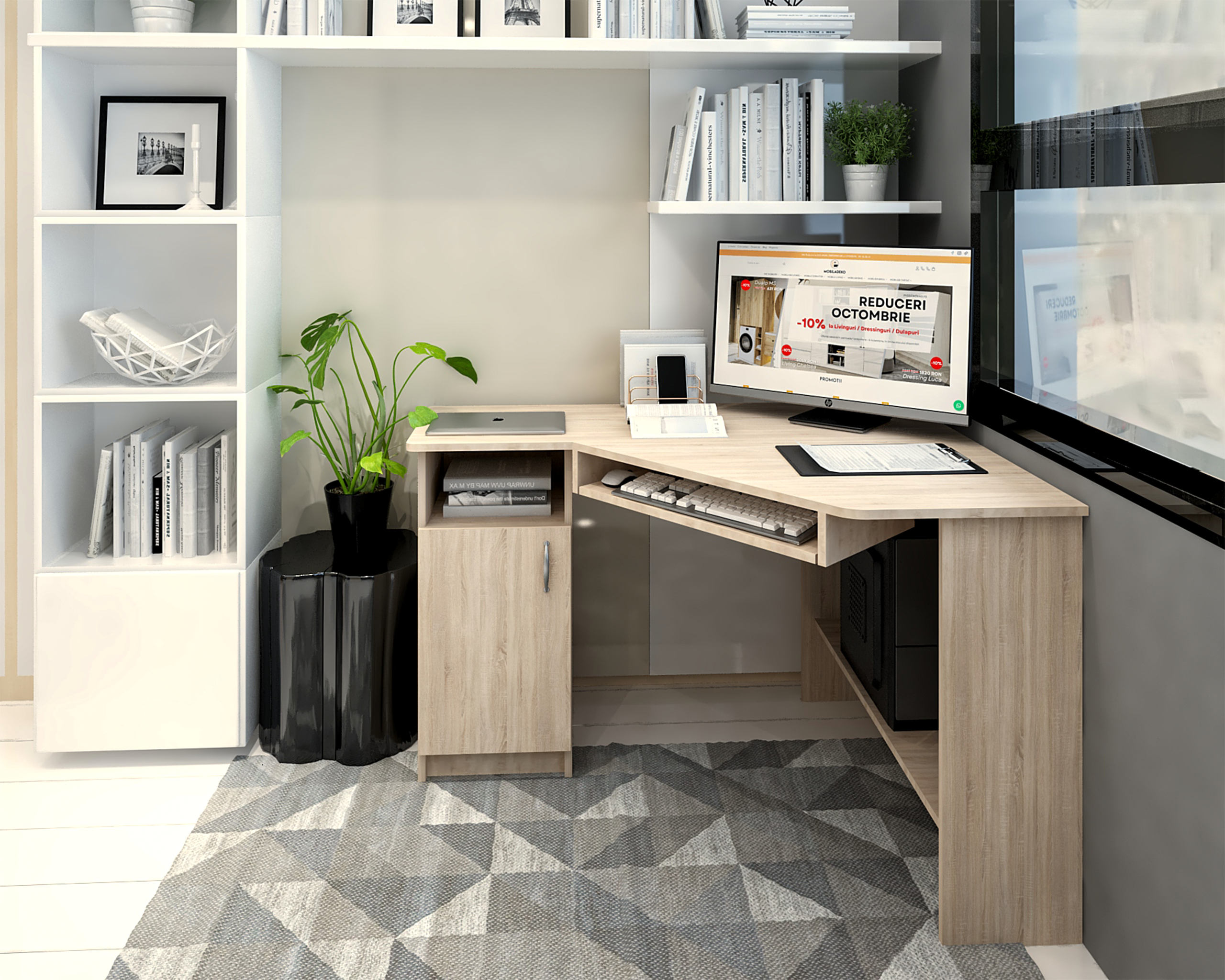 Biroul SU 14 este un birou pe colt, prevazut, pe latura din stanga ( lungime =120cm),este prevazuta cu 1 corp cu 3 rafturi si 1 usa . Latura din partea dreapta ( lungime 90cm ),cu suport glisant pentru tastatura si un raft depozitare in partea inferioara .