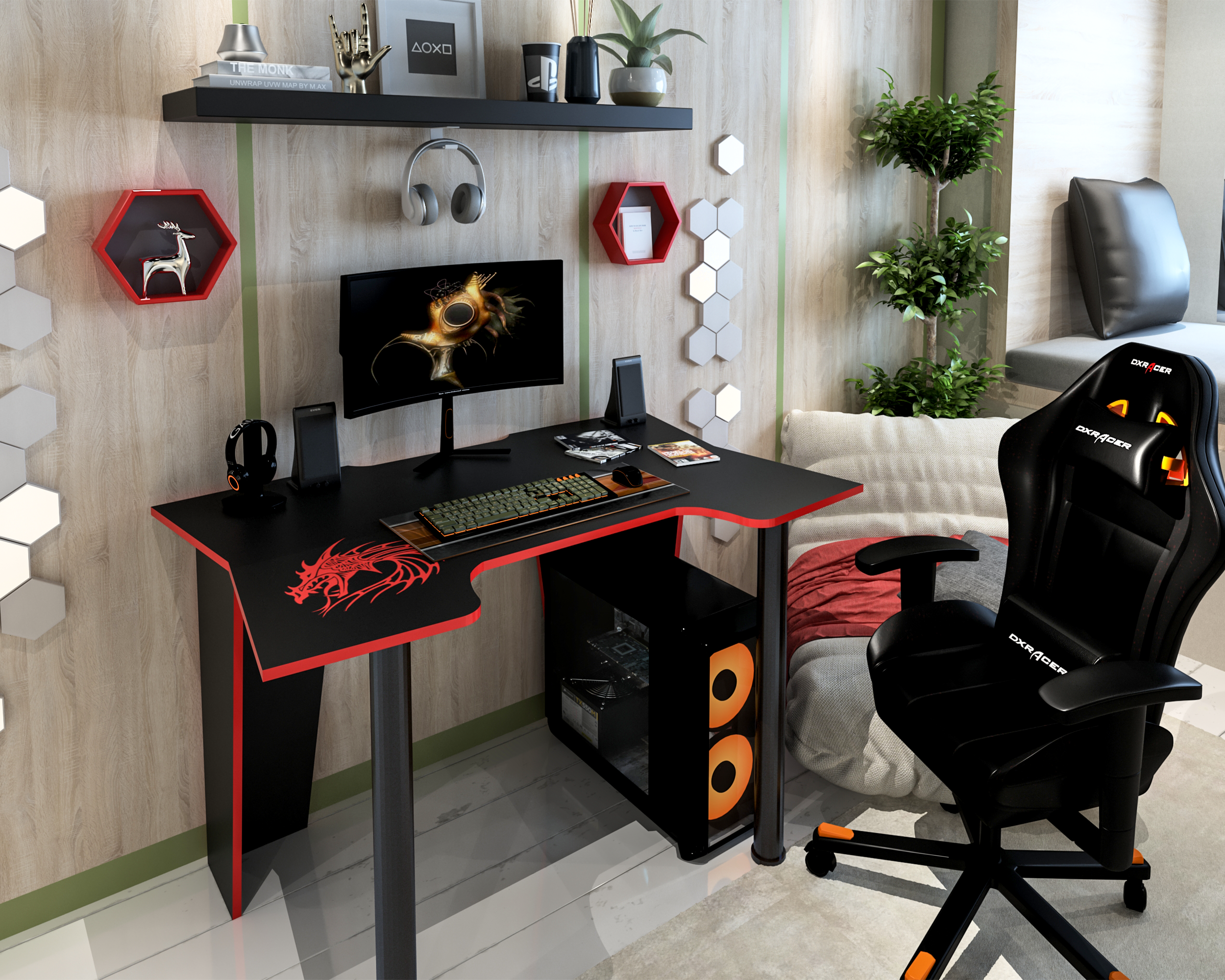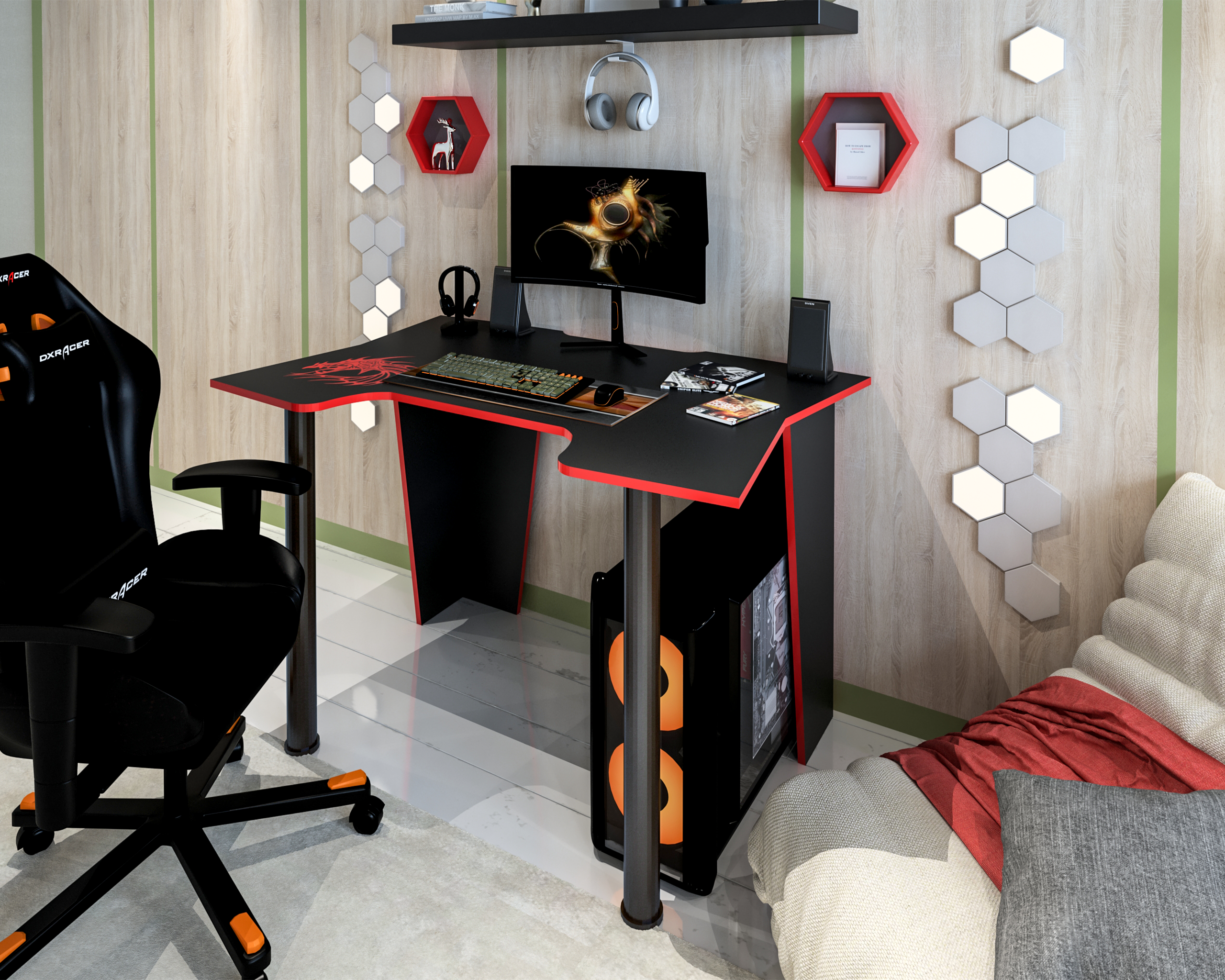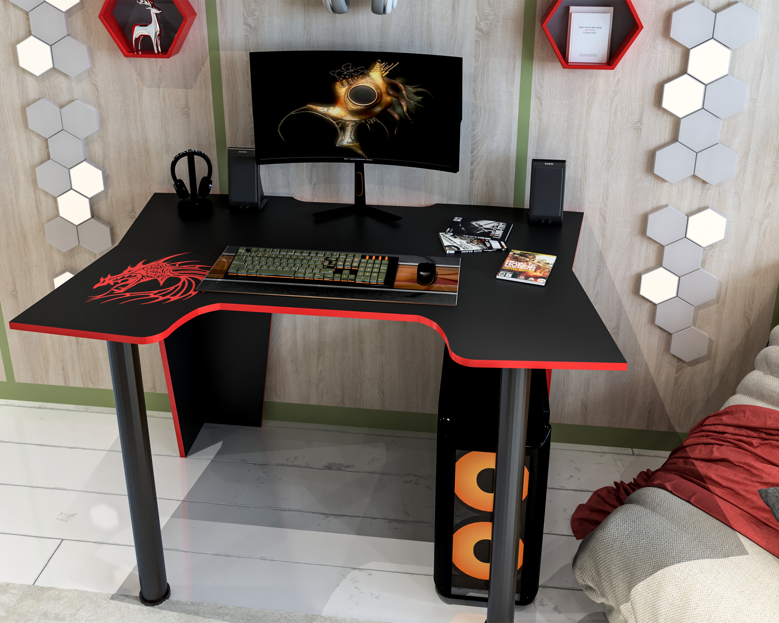 ● Este un birou modern, realizat din PAL melaminat, cantuit cu abs rosu.