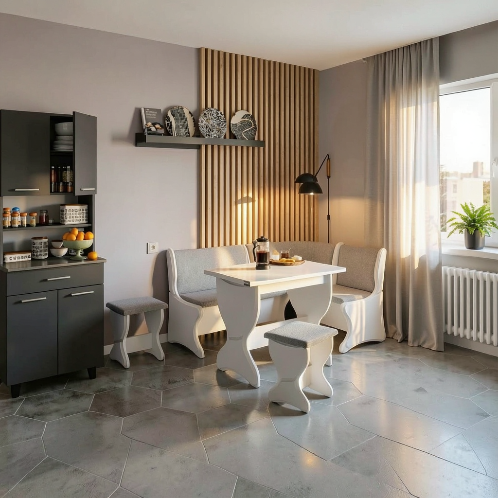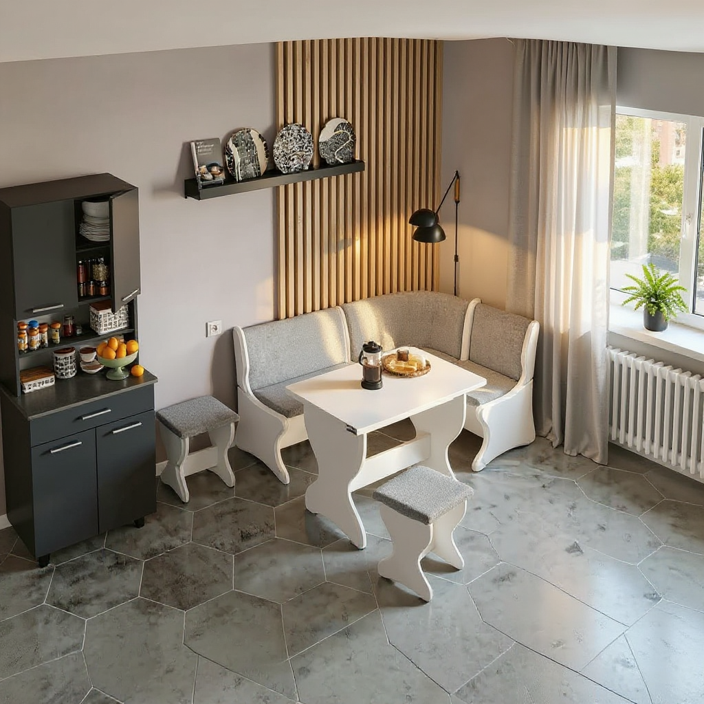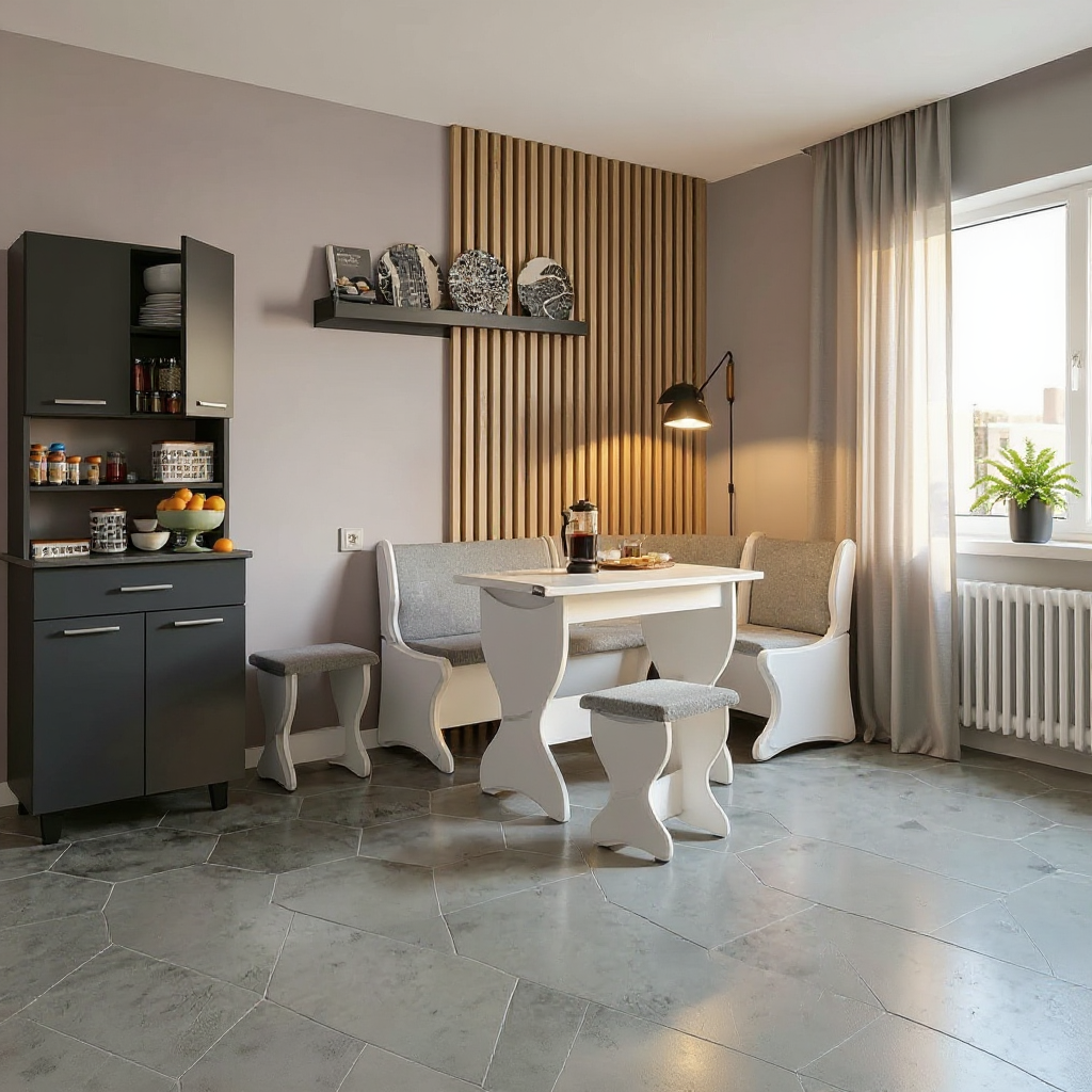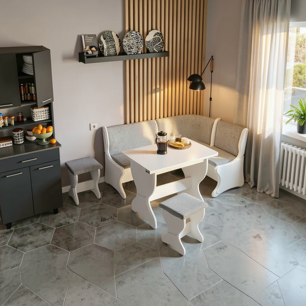Cadrul este din Pal melaminat de nuanta Alba, sezutul si spatarul din burete cu stofa gri.