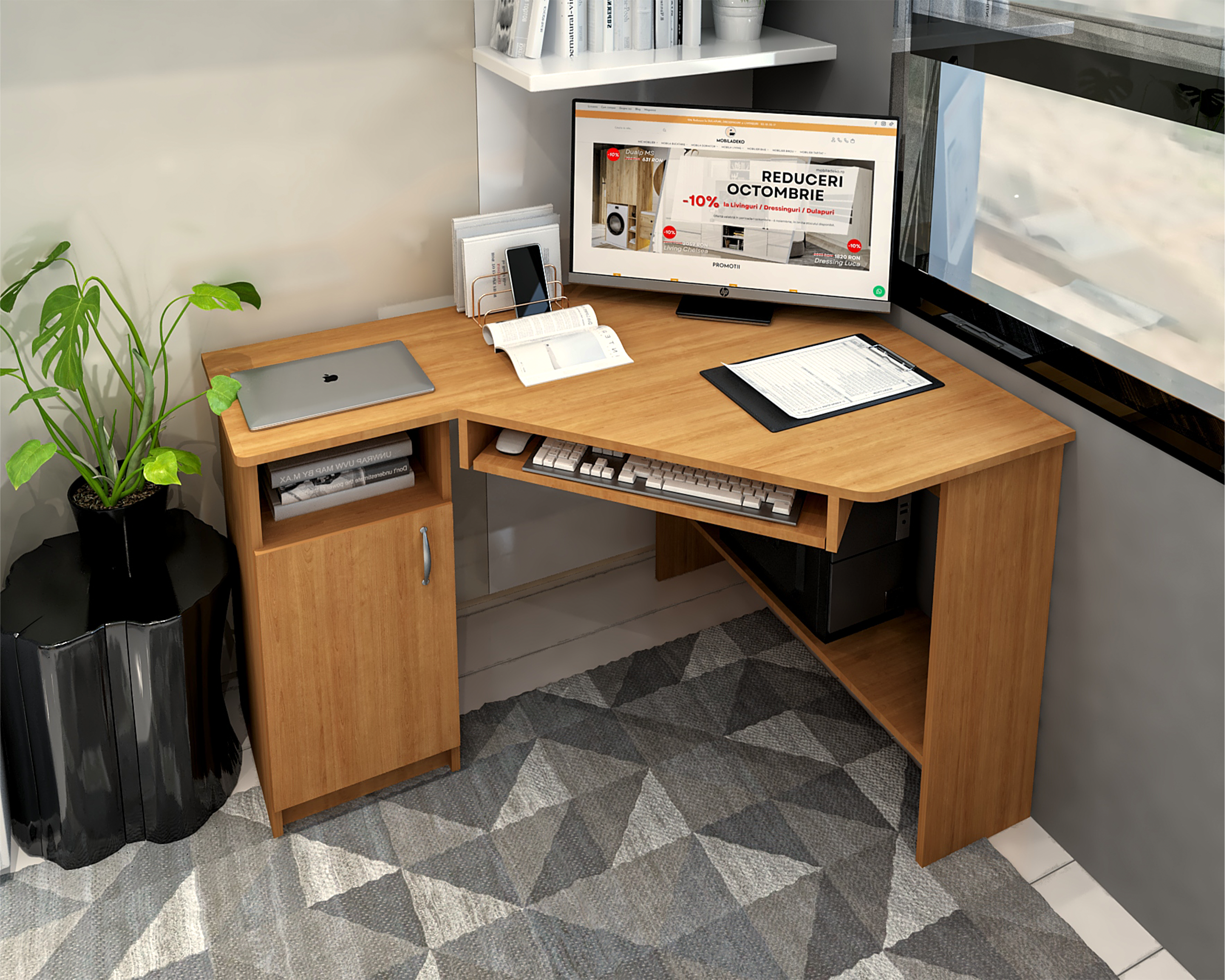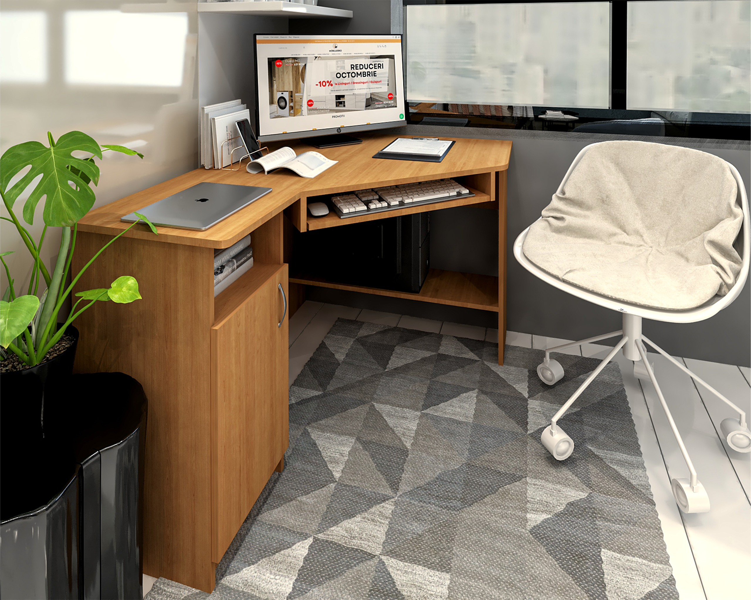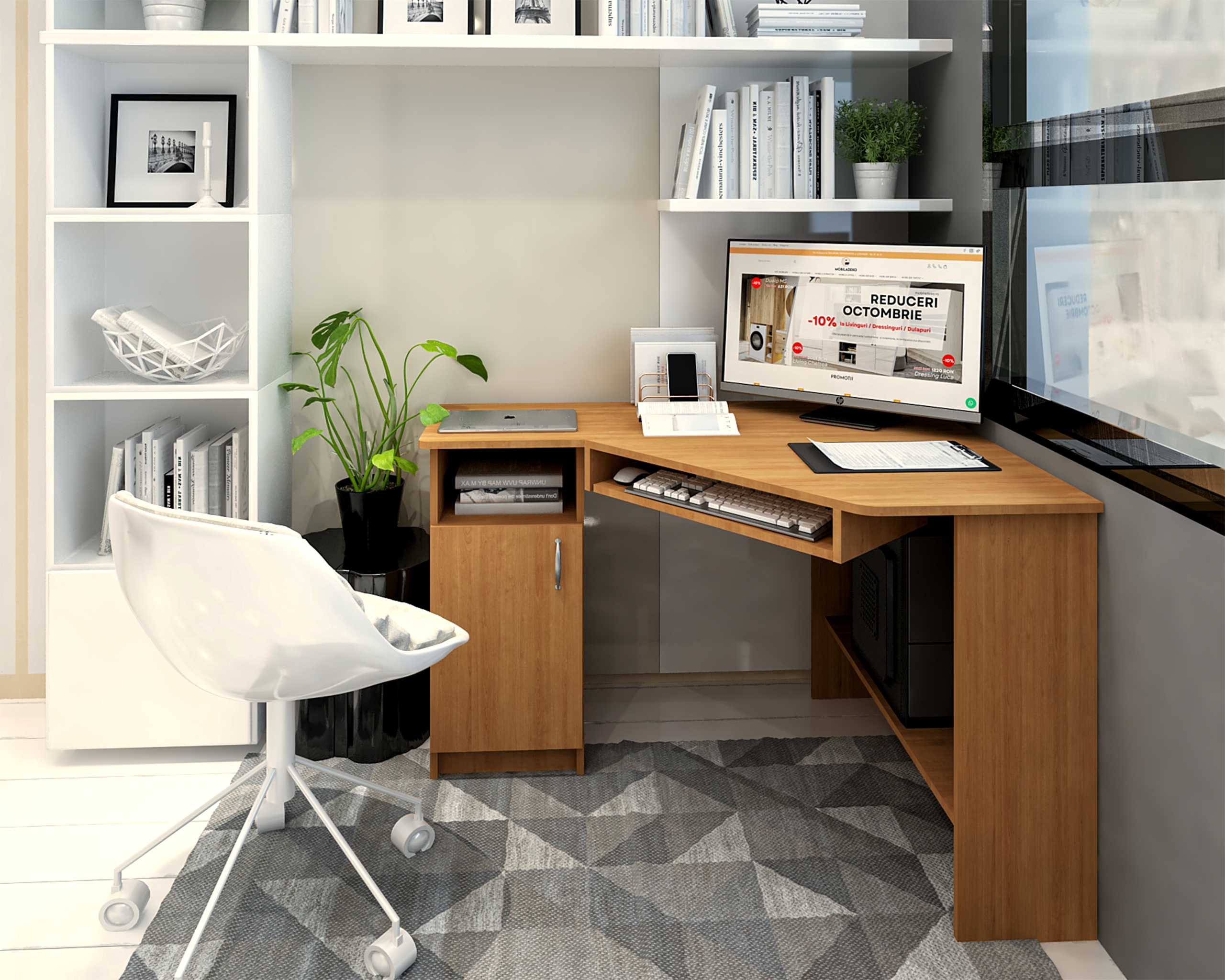 Biroul SU 14 este un birou pe colt, prevazut, pe latura din stanga ( lungime =120cm),este prevazuta cu 1 corp cu 3 rafturi si 1 usa . Latura din partea dreapta ( lungime 90cm ),cu suport glisant pentru tastatura si un raft depozitare in partea inferioara .