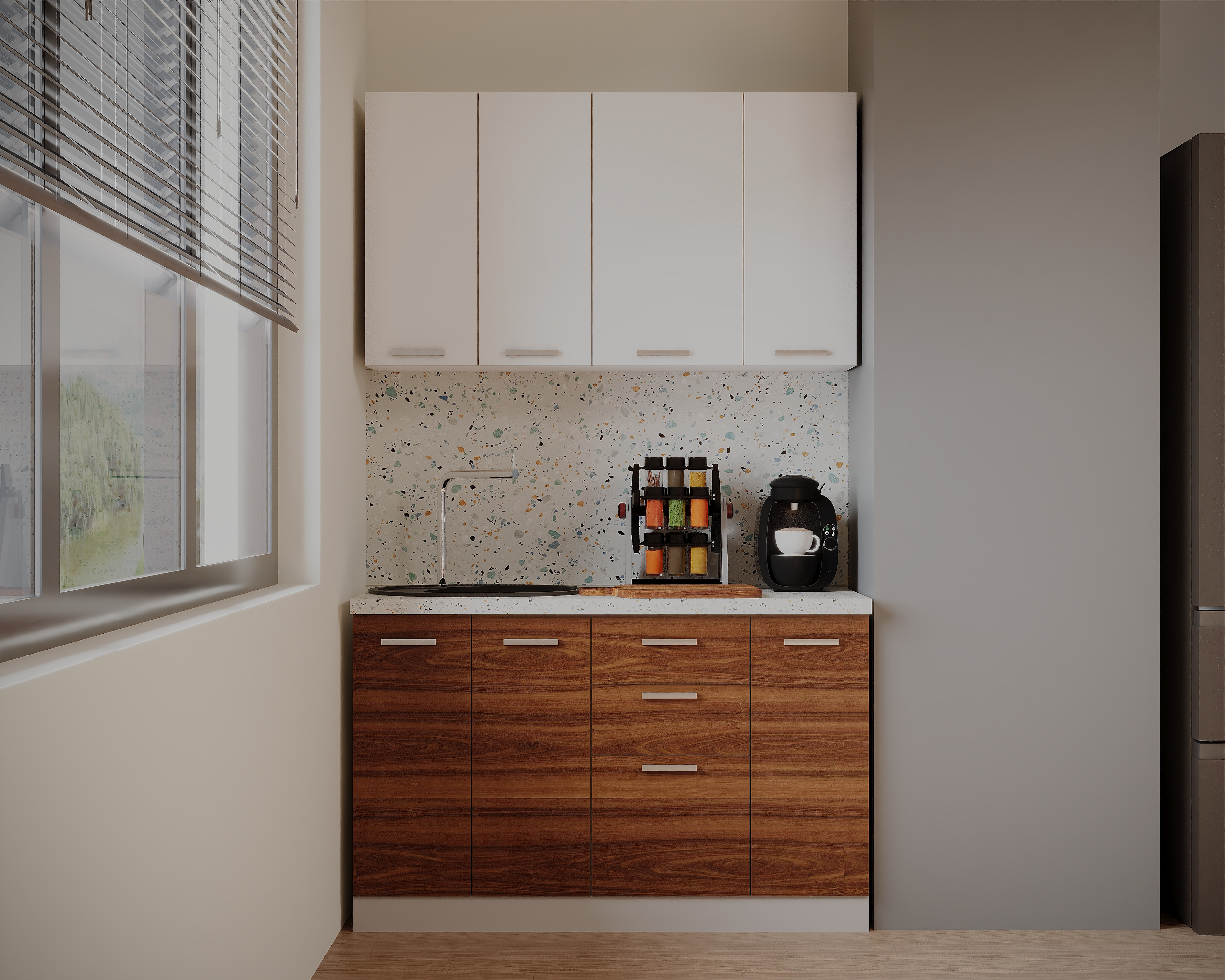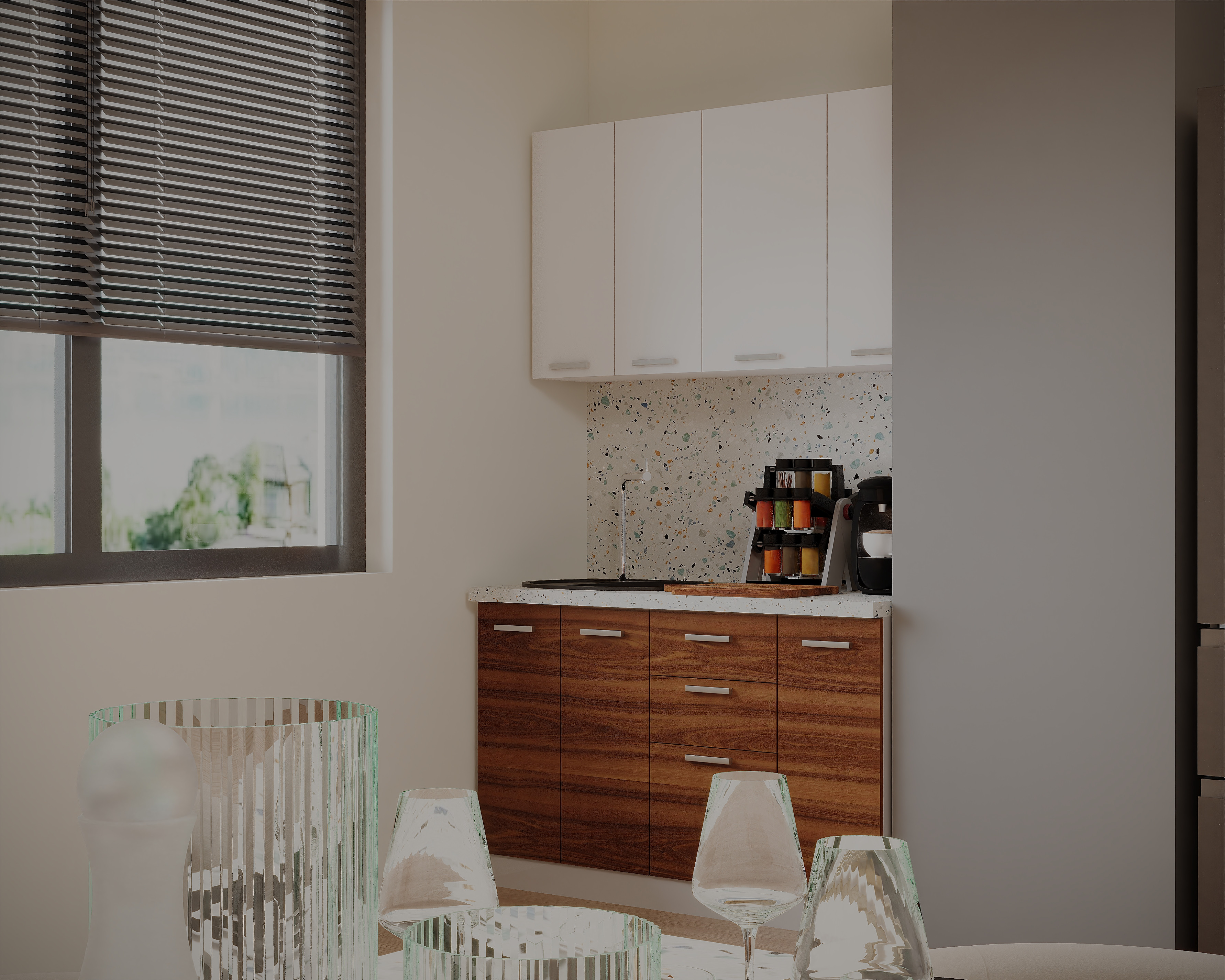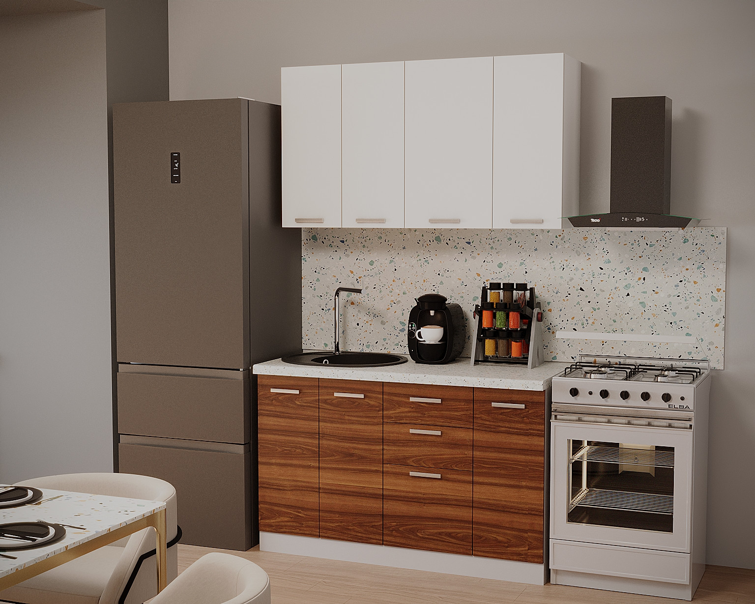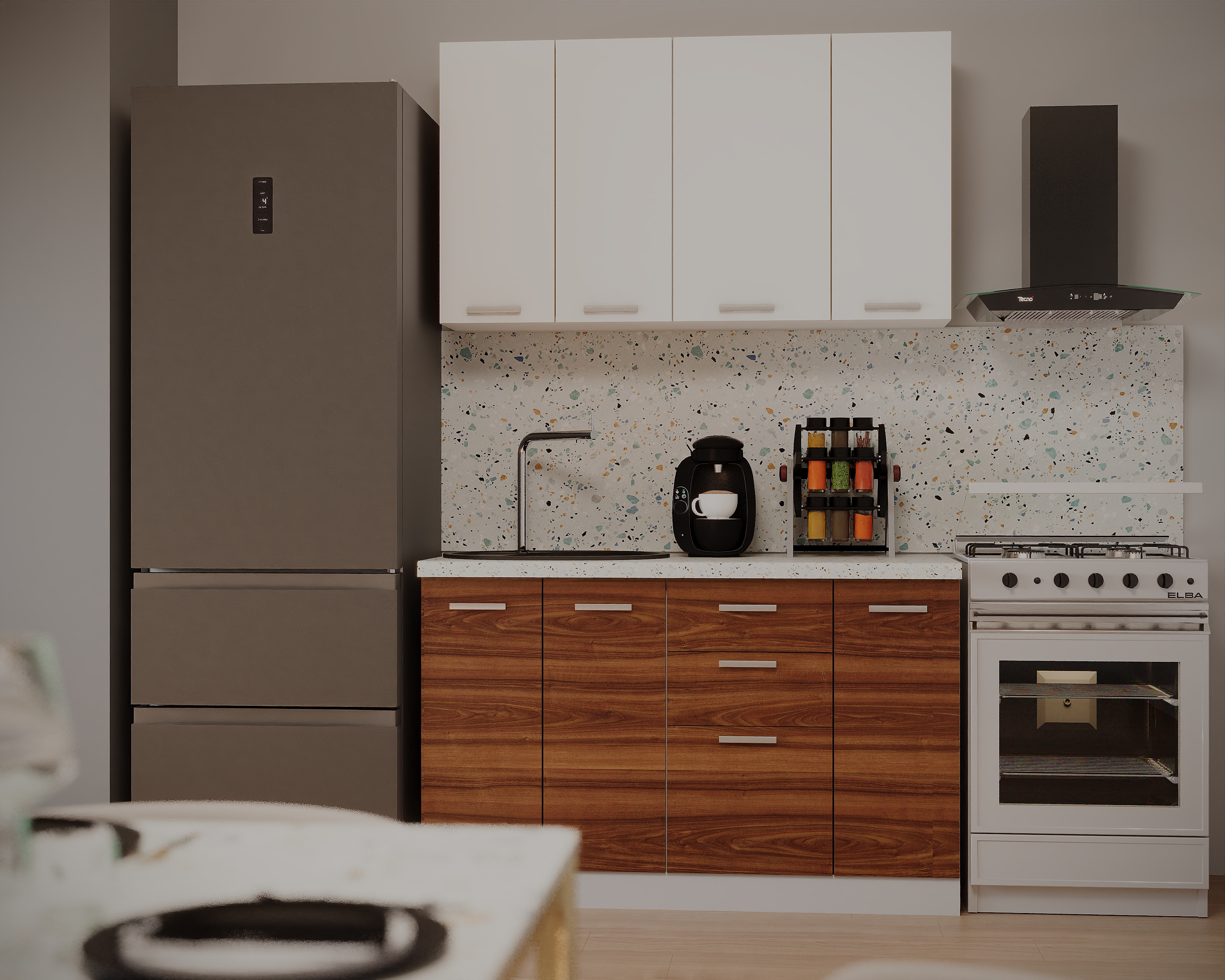 Partea inferioara este formata dintr-un corp de 30cm cu 1 usa, o masca de 60cm, un corp de 40cm cu 3 sertare si blat termorezistent ( blat pentru fiecare corp in parte ) mai putin la corpul masca de chiuveta. Partea superioara este formata dintr-un corp de 60cm, 1 corp de 40cm si 1 corp de 30cm.